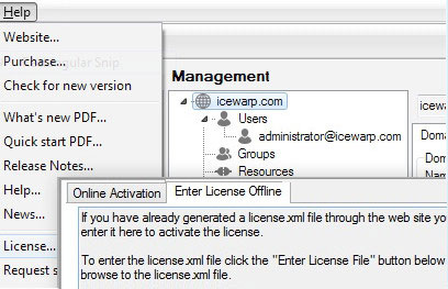 Если вы его не получили, проверьте папку нежелательной почты или свяжитесь с поставщиком IceWarp. Далее загрузите license.xml в опции "Активировать лицензию" внутри консоли администрирования IceWarp, во вкладке Ввод лицензии оффлайн.